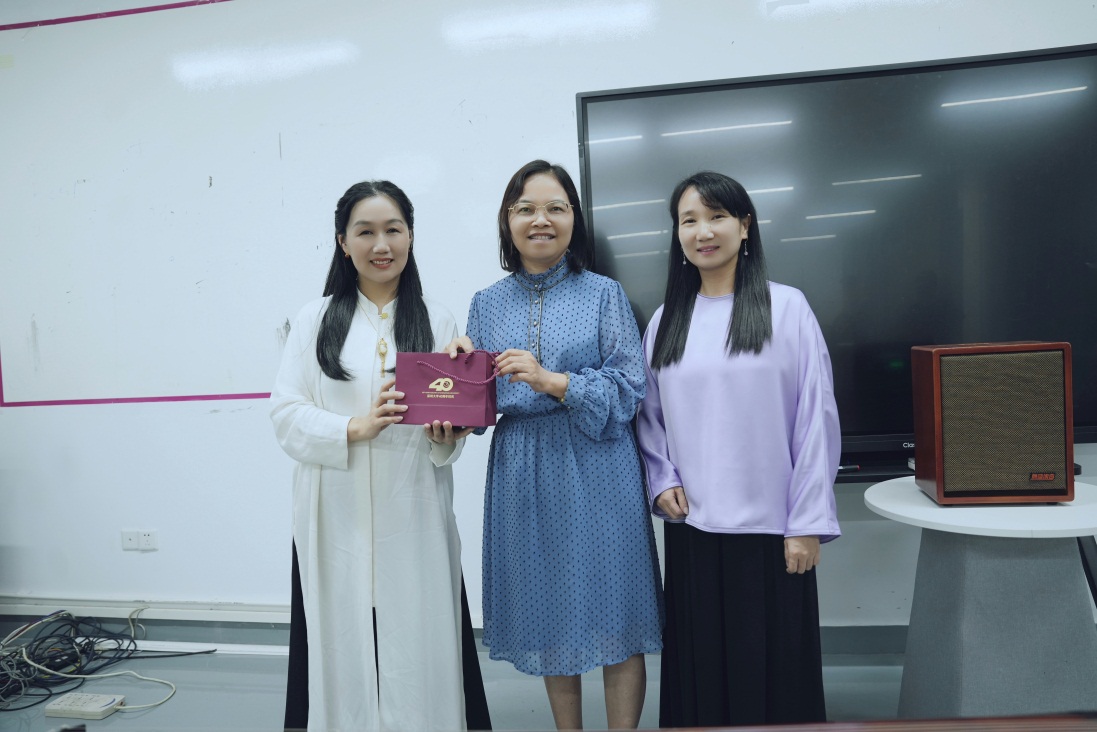 讲座结束后,学院工会主席区莹代表学院给芮老师赠送深大纪念品。