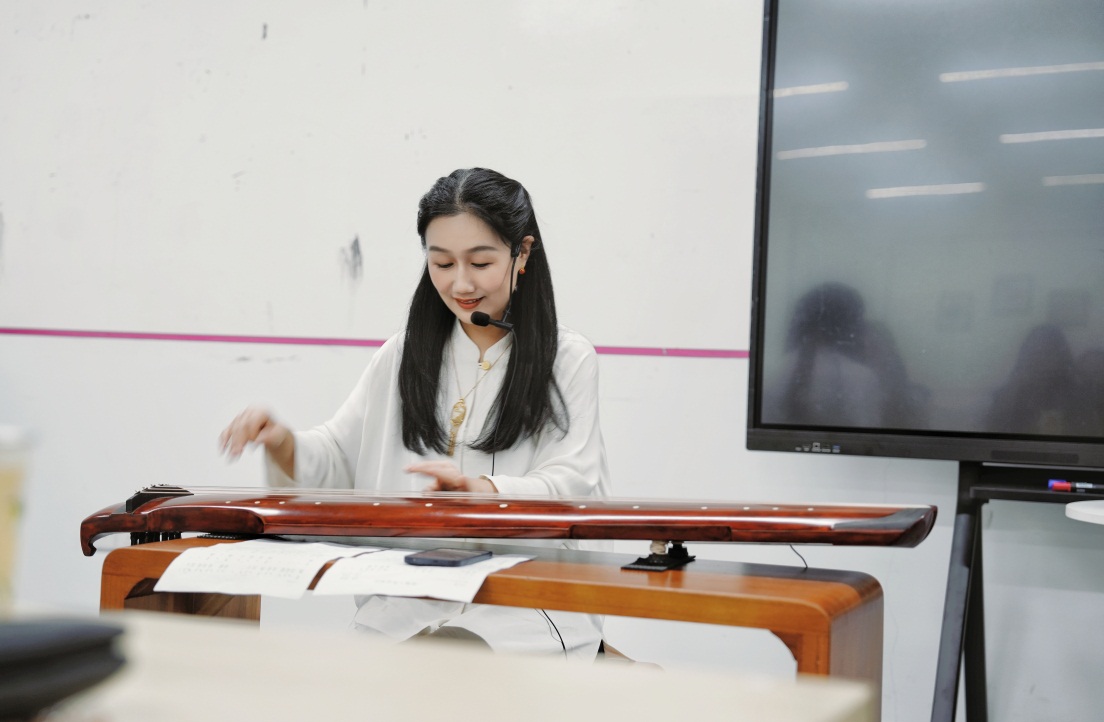 在演奏环节,芮老师弹唱了自己编曲的琴歌《一剪梅·舟过吴江》,随后她独奏了传统曲目《醉渔唱晚》,最后与学生共同演绎了古琴二重奏《残月》。这些曲目不仅展示了古琴音乐的多样性,也让观众深刻体会到了古琴音乐与戏曲等不同艺术类型的相通之处。