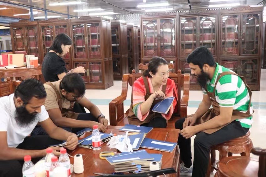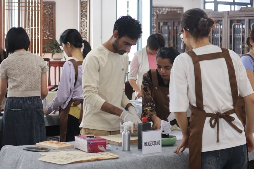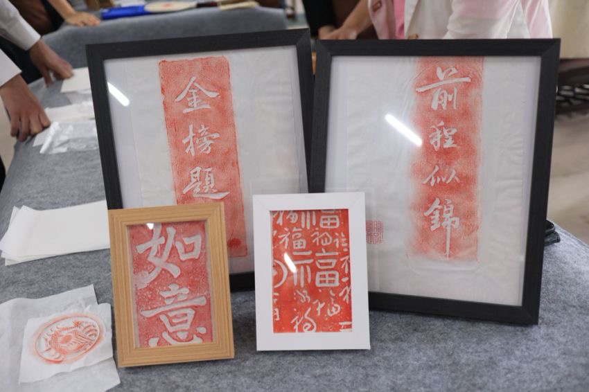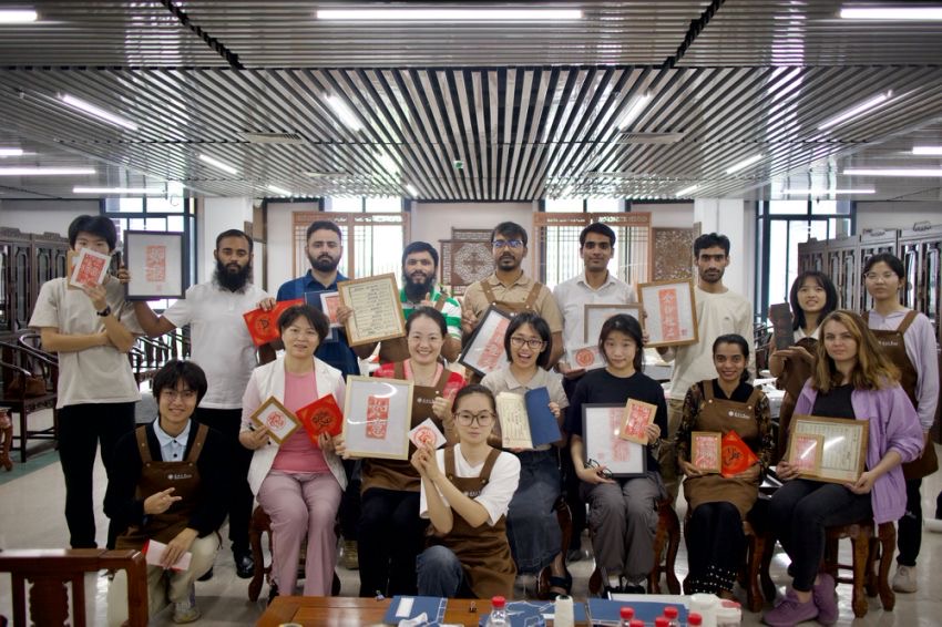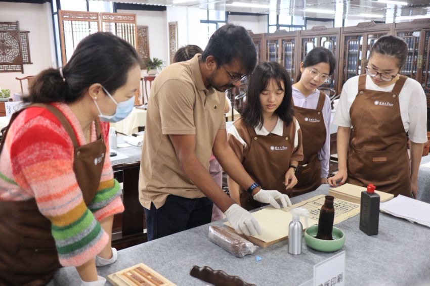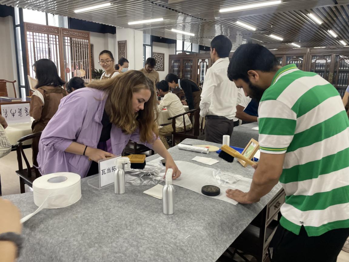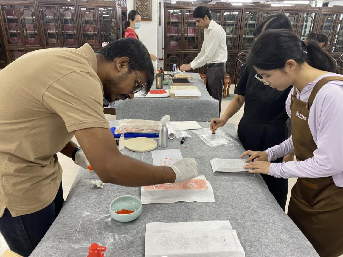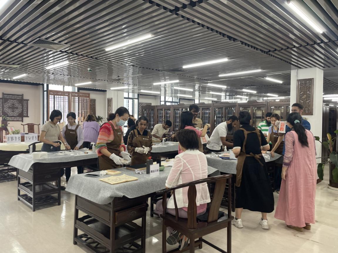 深圳大学国际交流学院、深圳大学“以文润心”国情教育工作室基地联合深圳大学图书馆,于2024年11月13日在汇典楼6楼举办了一场拓印及古籍装帧体验。国际交流学院秦晴副书记和李峰玲老师带领10多名来自南非、巴基斯坦、孟加拉、马来西亚、苏丹等国家以及中国香港地区的本科生、研究生和交换生参与了此次活动。现场布置古香古色,仿佛让人穿越回古代。