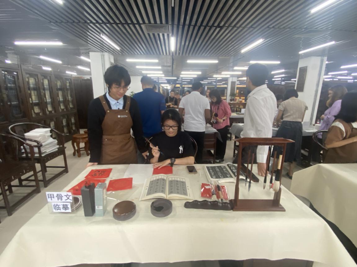 小型甲骨文书展为同学们打开了了解甲骨文的窗口,那神秘的古老文字吸引着大家探寻背后的秘密,猜测着每个甲骨文所代表的含义。现场临摹甲骨文书法,让同学们在挥毫泼墨间感受书法艺术的韵味,体会到古老文字与书法魅力融合的独特意境。