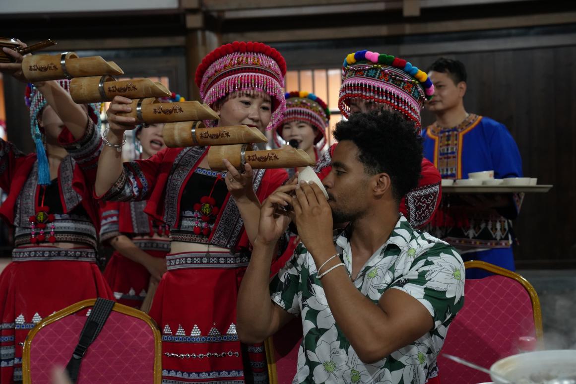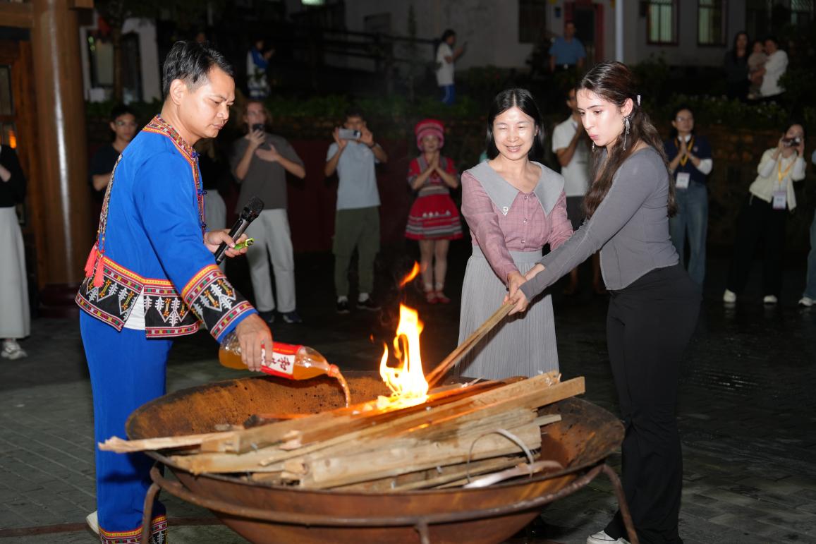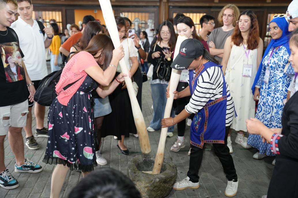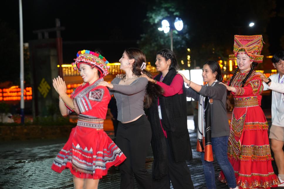 下午,国际学生前往瑶族古村,在这里进行了瑶族传统服饰体验,体验瑶族特色舂糍粑、竹竿舞,参观了灵芝种植基地,品尝瑶族特色美食长桌宴,体验了瑶族独有的高山流水敬茶仪式,体验富有浓厚的民族特色和节日氛围的瑶族篝火舞,观赏瑶族舞蹈《瑶鼓声声》和《茶山韵》。国际学生一行深刻感受到了瑶族文化的丰富多彩和深厚底蕴,直面体验百千万工程下瑶族古村改革更新后的精神风貌,了解中国新农村建设的丰硕成果和乡村建设的新局面。