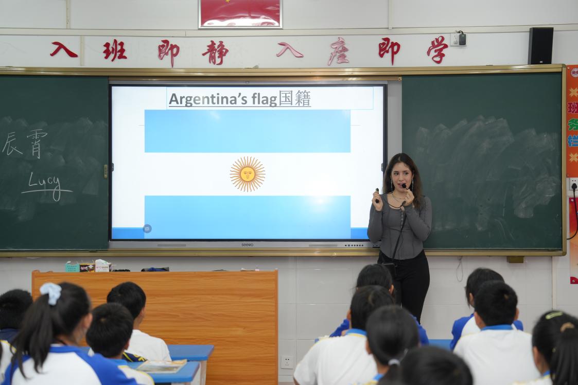 同时,来自阿根廷的路辰霄同学来到七年级教室,给小朋友们开展文化课堂,传递来自世界的声音,实现文化互鉴与交流,为瑶族中学生打开世界之窗。