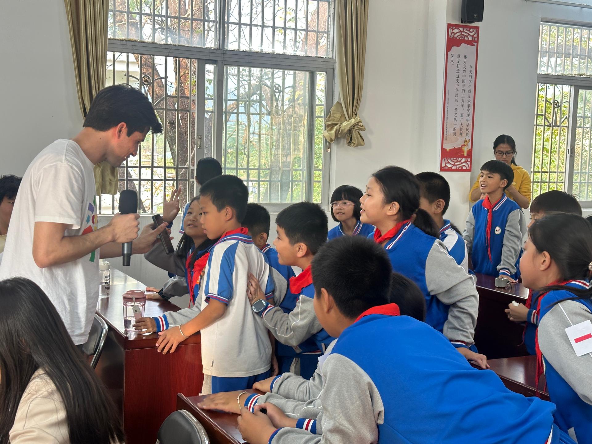 下午,国际交流学院师生前往平东镇中心小学,开展捐赠及文化体验活动。捐赠仪式现场由平东镇中心小学书记叶汉忠主持,海丰县教育局副局长周伟津、平东镇党委组织委员施圣嫔、深圳大学国际交流学院副院长郑捷等师生出席。国际交流学院党总支购买了一批图书、体育用品和文具,党员老师们也积极踊跃捐赠图书绘本,助力平东镇中心小学学生丰富课余生活,在增进知识储备的同时也加强锻炼身体。捐赠仪式结束后,参与实践活动的国际学生同三十余名小朋友开展了生动有趣的文化交流活动。国际学生通过分享不同国家的文化习俗、饮食服饰、节日语言等,为小朋友们徐徐铺陈绮丽多姿的世界文化画卷,拓宽国际视野。
