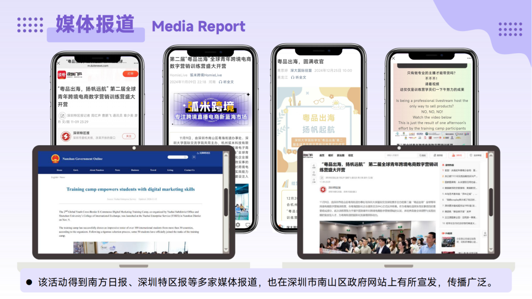 此次“粤品出?!毖盗酚玫搅四戏饺毡ā⑸钲谔厍ǖ榷嗉抑髁髅教宓墓惴罕ǖ?,活动成果也通过深圳市南山区政府官网进行了发布,进一步扩大了项目的社会影响力。通过媒体的宣传与报道,训练营的成效得到了更广泛的认可,并为深圳大学在国际化教育领域的探索和实践积累了宝贵的经验。